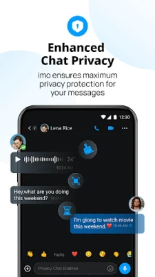 Vaša privatnost je naš prioritet. imo implementira vrhunske sigurnosne mjere poput Time Machinea, poruka koje nestaju, privatnih razgovora, zaštite zaslona i end-to-end enkripcije kako bi vaše komunikacije bile potpuno zaštićene. Imate potpunu kontrolu: brišite poruke, postavljajte tajmere za nestajanje sadržaja i blokirajte snimanje zaslona, kopiranje ili dijeljenje. Osim privatnih veza, imo vas poziva u svoj VoiceClub – dinamičan prostor za zabavu i zajedništvo. Kreirajte ili se pridružite sobama kako biste razgovarali, slušali glazbu ili sudjelovali u raznim događajima poput natjecanja talenata, talk showova i igara, stvarajući nezaboravne trenutke s obitelji i prijateljima.