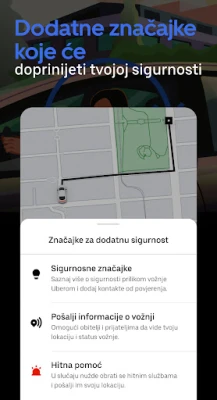 Vaša sigurnost naš je prioritet. Svaka vožnja s Uberom utemeljena je na najvišim sigurnosnim standardima, od polazne do odredišne točke. Stoga neprestano razvijamo nove sigurnosne značajke i ažuriramo smjernice zajednice kako bismo osigurali pozitivna iskustva puna poštovanja. Prije potvrde vožnje, uvijek ćete vidjeti procjenu cijene, a svoju lokaciju i status vožnje možete lako podijeliti s bliskim osobama. U slučaju potrebe, aplikacija omogućuje izravan poziv hitnim službama s prikazom vaše lokacije i detalja vožnje.